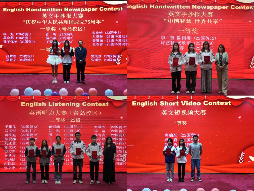 本次英语文化节闭幕式暨颁奖典礼在青岛、泰安两校区全程同步直播。刘珉在致辞中深刻解析了“中国智慧·世界共享”这一主题,肯定了本届英语文化节的成功举办。她在祝贺获奖选手取得优异成绩的同时,也勉励学生在活动中掌握好英语,在学习和生活中不断攀登新的高度。Lucy通过鲜活的案例,强调在人工智能大背景下,语言学习依然具有重要意义。到场嘉宾为本届英语文化节“金牌挑战”系列赛中的获奖学生代表颁发了荣誉证书。