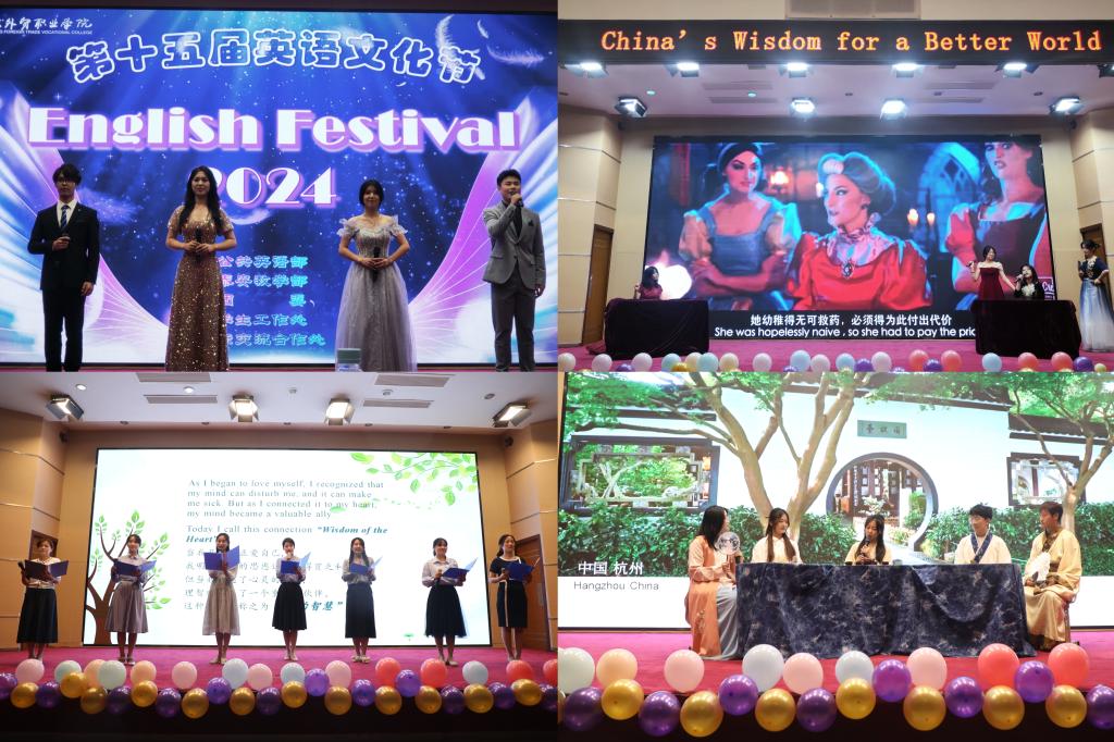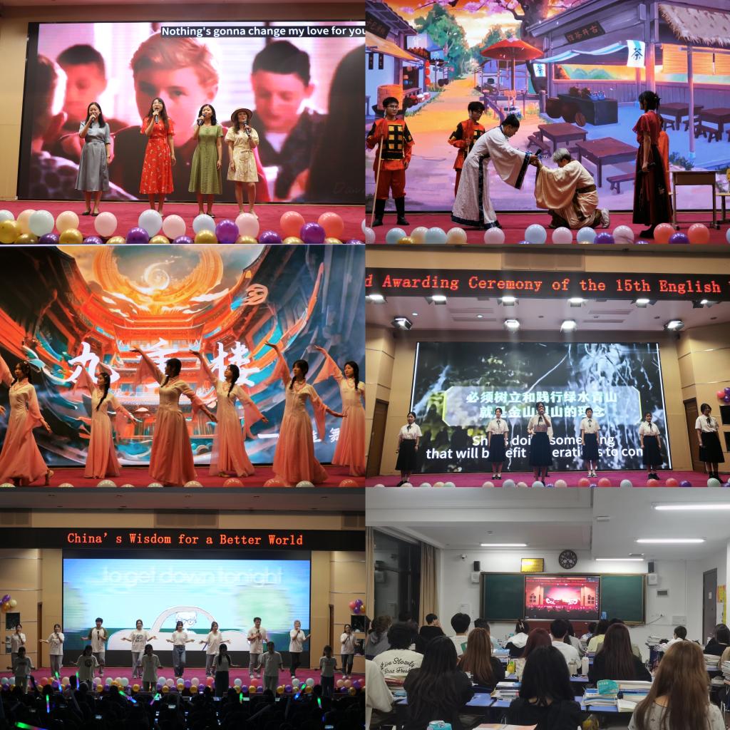 此外,由我院大学生艺术团、英语俱乐部和公共英语部教师带来的节目也是精彩纷呈。深情款款的经典英文歌曲串烧、独具魅力的中国传统舞蹈以及青春洋溢的英文合唱都使中西文化在视觉和听觉上产生了巨大的碰撞。英文配音大赛中的优秀获奖学生刘泳萱、于鹏飞、夏天等带来了声情并茂的电影配音表演,让观众体验了一次原声再现的震撼。脱口秀《茶语幽幽》和话剧《花木兰》以全新的视角用英语讲述了中国故事,引发观众对传统文化的共鸣和女性力量的思考。环保主题的朗诵《大自然》不仅生动诠释了大自然的呼吁,也展示了我国为环境保护所作的努力。公共英语部教师通过精彩的英文诗朗诵和经典英文歌曲,为闭幕式增添了更多的精彩。最后,随着优秀作品的展示和文化节精彩瞬间的回顾,第十五届英语文化节闭幕式暨颁奖典礼圆满结束。