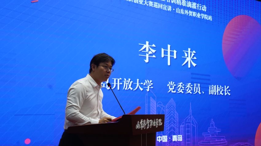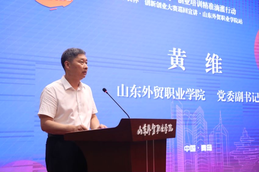 本次活动由青岛市教育局、青岛市民营经济发展局、青岛市人力资源和社会保障局、青岛市总工会、青岛开放大学(青岛创业大学)主办。青岛开放大学(青岛创业大学)副校长李中来,我院党委副书记黄维出席宣讲活动并致辞。青岛开放大学(青岛创业大学)有关领导、创业导师及来自高校、投行机构的专家等出席活动,我院优秀师生创客代表百余人参加活动。
