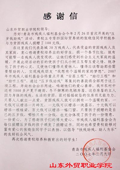 在2月26日青岛市残疾人福利基金会首次开展的“压岁钱助残”活动中,我院五专零四国际贸易班的张晓佳同学积极参与,为贫困残疾人捐赠了100元钱。为此,青岛市残疾人福利基金会特地给我院发来感谢信,代表岛城30万残疾人,代表受益的贫困残疾人及其家庭,感谢我院培养和教育出这样富有爱心的好学生。