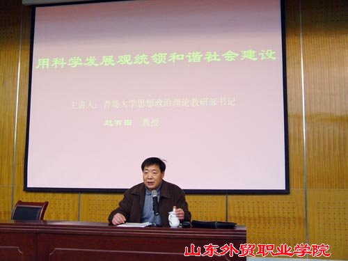 12月21日下午,学生工作部(处)、宣传部联合组织举办了报告会,邀请青岛大学思想政治理论教育部书记赵有田教授做了题为《用科学发展观统领和谐社会建设》的报告。报告会由魏长征副书记主持,团委、各系书记、辅导员、全体学生党员和部分学生干部参加了报告会。