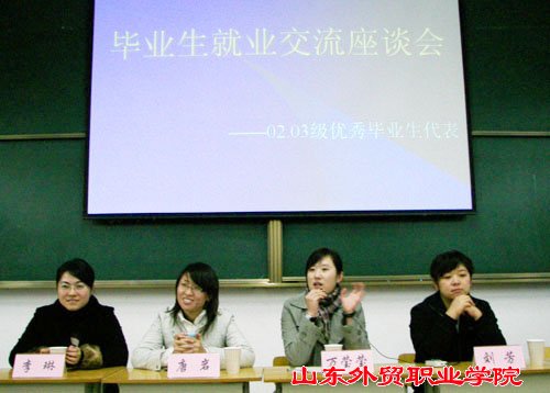11月29日晚,国贸系邀请05、06届优秀学生代表刘芳等四位同学返校与临近毕业的04级同学举行面对面交流座谈会。四位同学介绍自己在就业过程中遇到的问题和应对的措施,为04级同学提供了有益的参考信息,并现场回答了大家的提出。