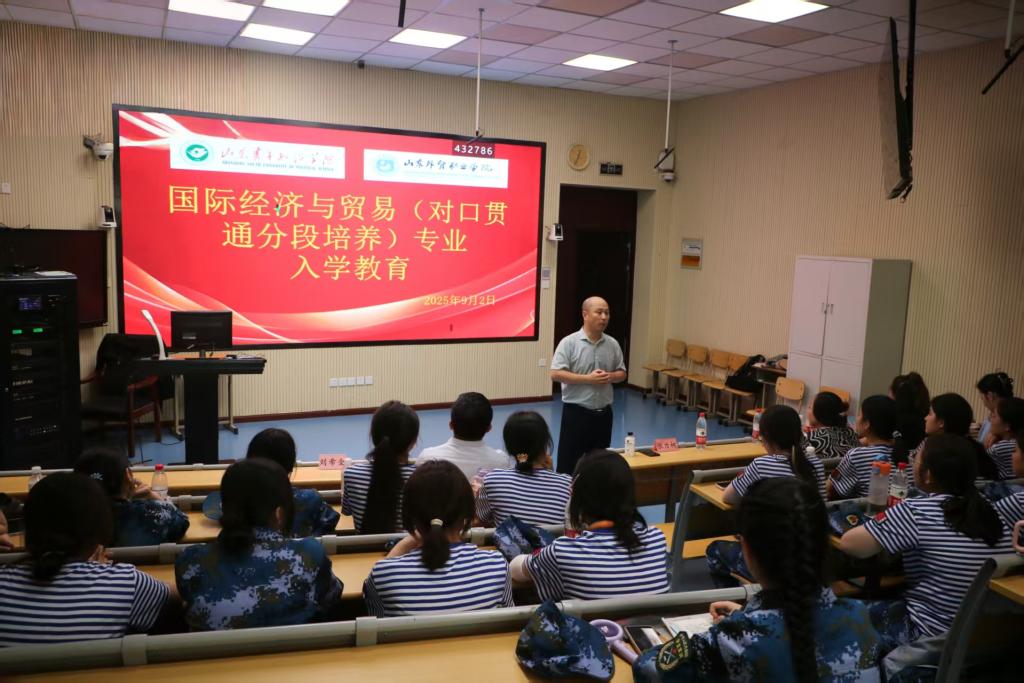 9月2日,国际贸易系举行对口贯通分段培养专业入学教育活动。山东青年政治学院国际经济与贸易专业负责人张力珂应邀出席,活动由国际贸易系副主任张宗英主持,国际贸易系主任刘希全及2025级对口贯通分段培养专业全体新生参加。