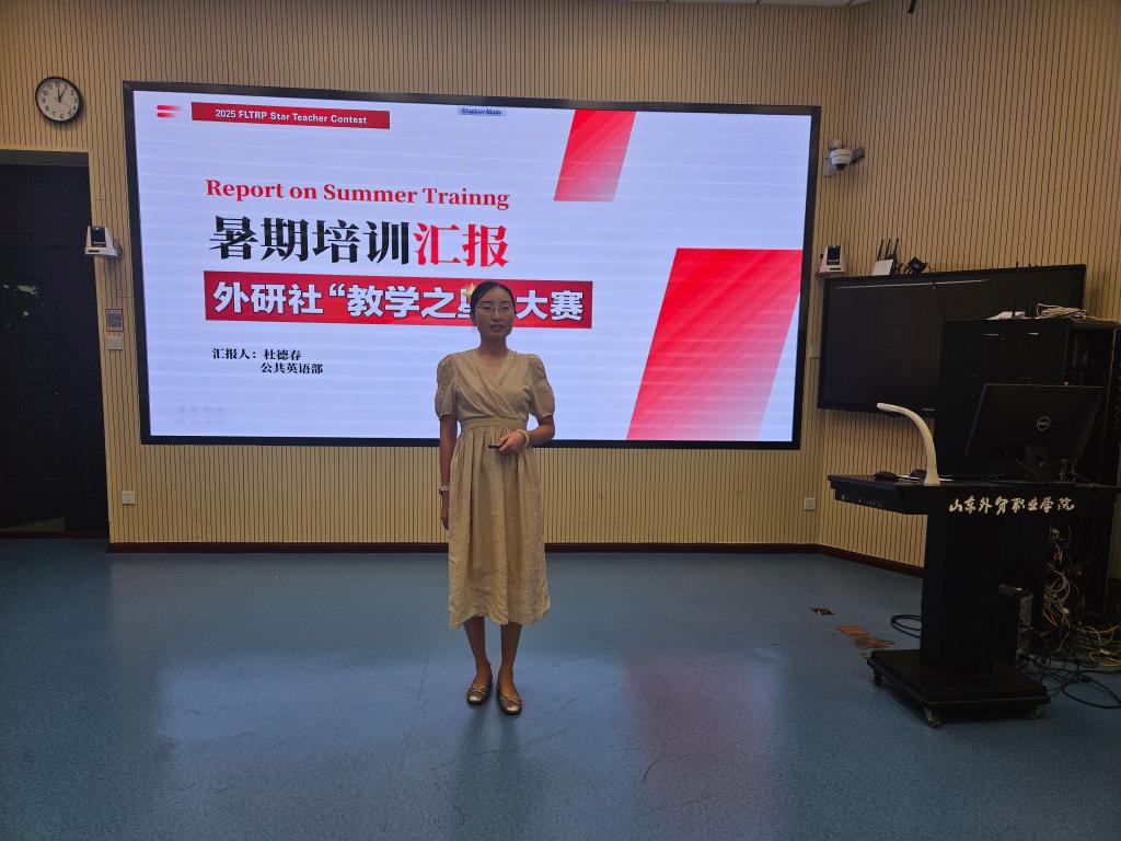 张琳以高职英语教学能力提升与数智化实践为核心,围绕其参加的山东省2025年职业院校教师素质提高计划国家级培训内容展开分享。她重点聚焦“五金新基建”背景下的产教融合路径,深入解读产出导向法(POA)、BOPPPS教学模式的创新应用场景,演示如何通过“目标设定——任务驱动——效果评估”的闭环设计提升课堂效率。此外,介绍技术赋能与德育融合的双重重要性,借助数字化工具搭建“英语+职业素养”的教学平台,在语言教学中渗透工匠精神与家国情怀,为职业教育高质量发展提供“理念+路径”的双重参考。 杜德春则围绕2025年暑期全国高校外语教学研究与教师发展系列研修班的学习内容,带来多维度的经验分享。她系统梳理了研修班三大核心专题的精华内容:详细介绍了大语言模型在词汇教学、写作批改、个性化测评中的应用实例;结合公共英语教学实际,深入解读从教材内容挖掘、课堂活动设计、第二课堂延伸三个层面推进“三进”工作,让思政元素自然融入语言教学;演示了U校园AI版的互动课件制作、实时学情分析、小组协作任务布置等功能,为教师们提供了可直接借鉴的数字化教学模板。除研修班内容外,杜德春还分享了暑期观摩“教学之星”大赛的心得。