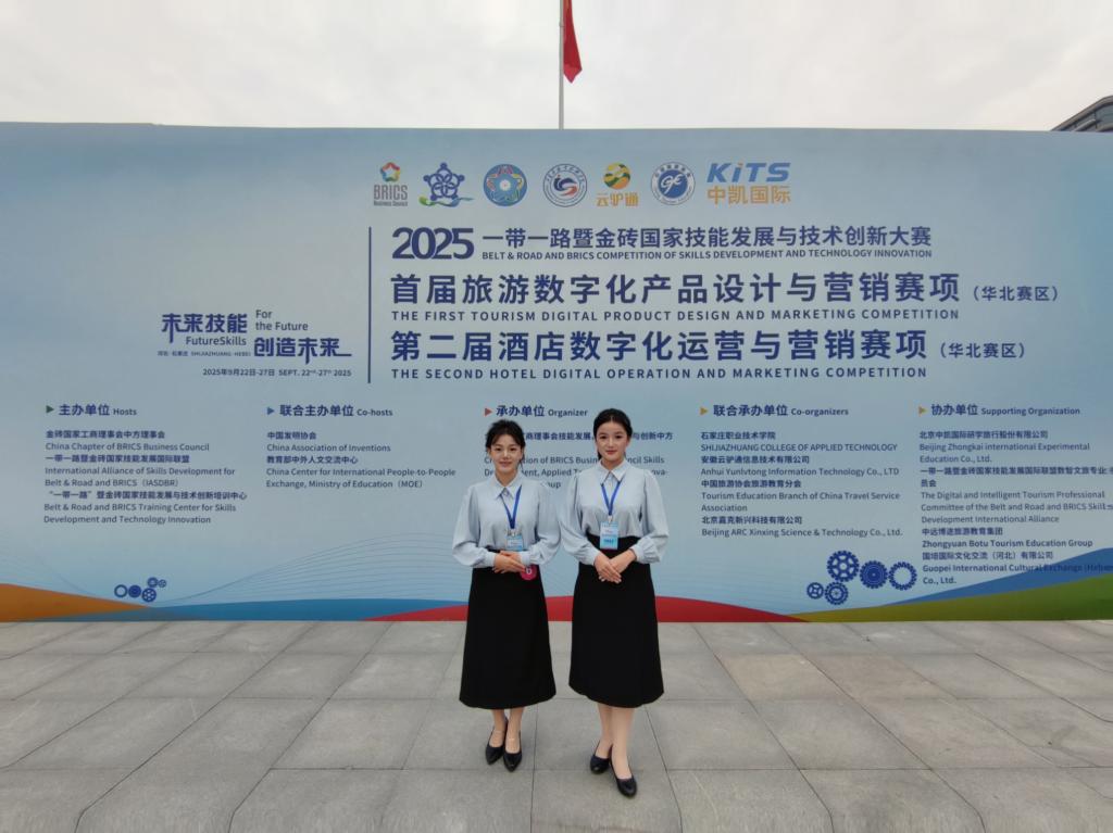 9月22日至24日,由金砖国家工商理事会中方理事会、一带一路暨金砖国家技能发展国际联盟等联合主办的“2025一带一路暨金砖国家技能发展与技术创新大赛”之首届旅游数字化产品设计与营销赛项华北赛区区域赛在石家庄职业技术学院举办,共有来自华北赛区24支代表队伍86名选手参加。我院24级旅游2班邵梦园、马有福两位同学凭借扎实的专业功底与出色的实践能力荣获三等奖,成功晋级全国决赛。