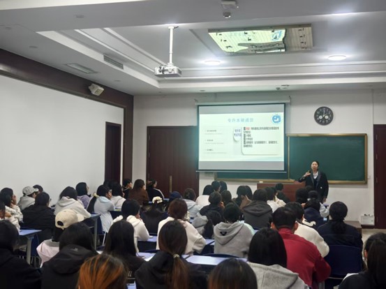 讲座由郭佳老师担任主讲,她结合近年来大学英语四级考试命题趋势,系统梳理了考试题型结构、评分标准及关键注意事项,围绕听力、阅读、写作与翻译等模块进行了深入讲解,并针对不同基础的学生提出分层备考建议,帮助学生明确复习重点,优化学习方法。