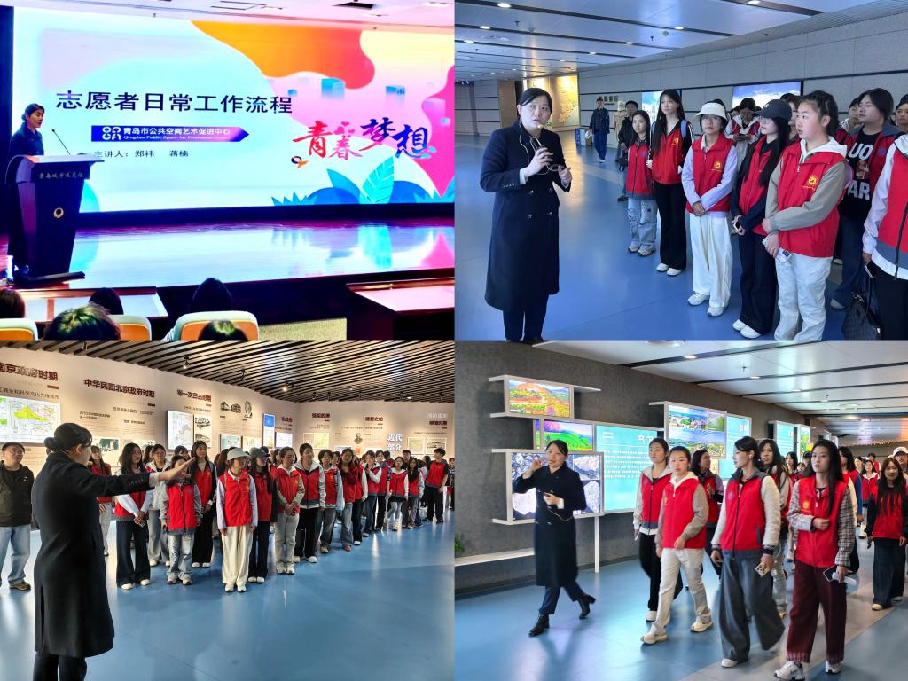 活动中,青岛城市展览馆郑祎为志愿者们详细介绍了志愿服务的具体分工、工作标准及注意事项,重点讲解了礼仪、咨询应答等服务细节。同学们纷纷就志愿服务工作中的疑问与工作人员展开积极互动。随后,工作人员带领全体志愿者实地参观展馆各区域,全面展示了志愿者工作的全流程,逐一演示了操作规范,确保志愿者们详细了解工作内容。后续,展览馆将为现场报名讲解岗位的志愿者进行专业培训。其他岗位的志愿者们也将陆续为参观的市民们提供服务,帮助中外游客更好地了解和感受青岛魅力。