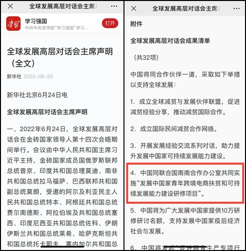 6月24日,全球发展高层对话会在金砖国家领导人第十四次会晤期间举行。会议由中华人民共和国主席习近平主持,金砖国家成员国以及其他受邀国家领导人出席会议。与会领导人围绕“构建新时代全球发展伙伴关系,携手落实2030年可持续发展议程”的会议主题,讨论共同关心的全球发展问题,并达成广泛共识。中国在会议上发布了本次对话会成果清单,共包括32个项目,将采取这些措施与合作伙伴一道支持全球发展。其中,中国同联合国南南合作办公室共同实施,由我院具体组织承办的“发展中国家青年跨境电商扶贫和可持续发展能力建设研修项目”在列。