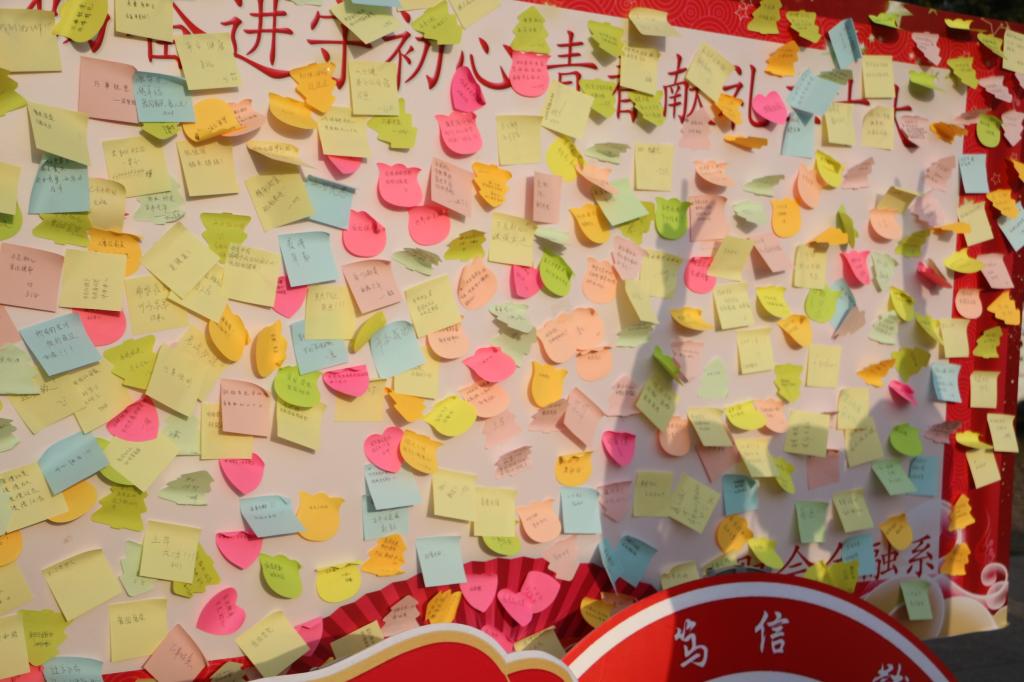 5月3日,财会金融系团总支在图书馆广场前开展“与你合影,赴青春活动”。同学们纷纷来到图书馆广场前与财金系卡通人物“团团” “财多多”“金小贝”合影,图书馆门前排起了长长的队伍。合影结束后,同学们把对党和国家的祝福以及自己未来的愿望都写在便利贴上,并贴在青年愿望墙上,用自己力量为团的百年华诞献上最美的礼物。