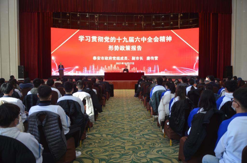 12月27日下午,泰安市副市长唐传营来到泰安新校区,围绕学习贯彻党的十九届六中全会精神,为广大师生作形势政策报告。学院党委书记林凌家主持报告会。