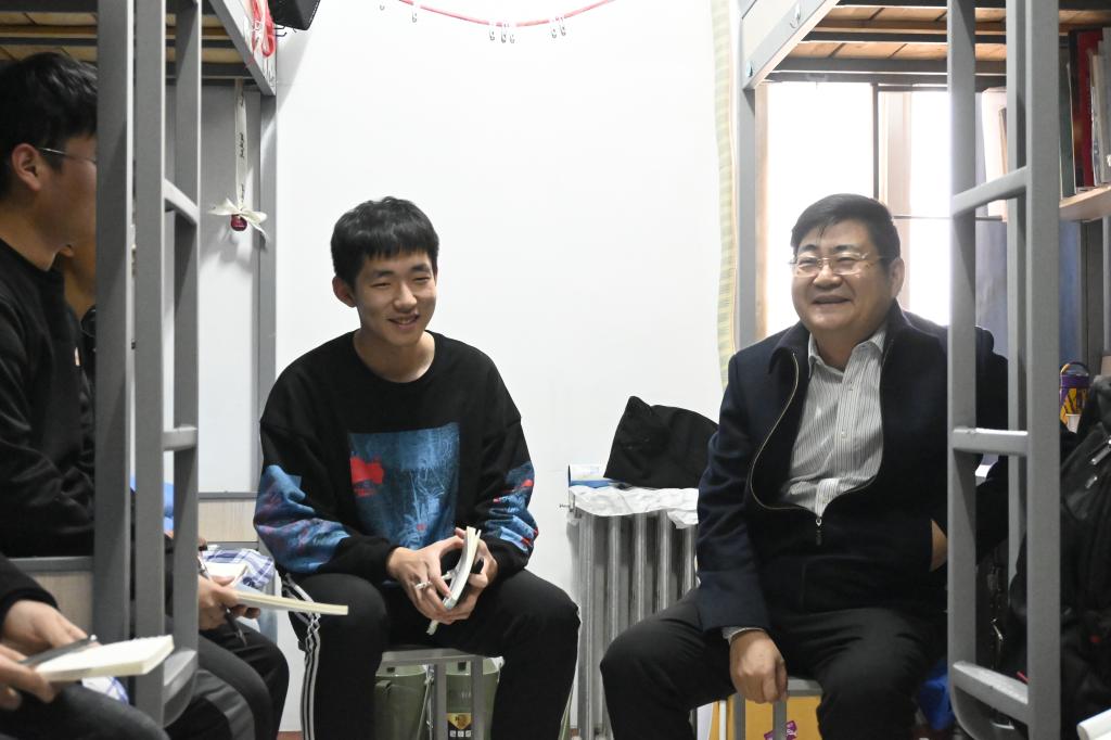 走访过程中,高成对学生宿舍安全、卫生、设施、文化建设等方面逐一进行了检查,叮嘱在宿舍的同学提升安全意识,克服“网瘾”,养成良好的学习、卫生和作息习惯。走访中,高成与学生亲切交谈,指出学生宿舍是大学校园里一个非常微小的“细胞”,建设什么样的宿舍文化对于大学生的成长成才至关重要,并勉励同学们:一要强化思想政治引领,以宿舍为平台建设学习型组织,让宿舍成为学生提高政治觉悟、树立远大理想、坚定崇高信念的学习之地,真正提升宿舍文化育人的实效;二要建设积极向上的宿舍文化,培育和弘扬社会主义核心价值观,做到知感恩、讲诚信、行礼仪,形成好学、乐学、善思、修身的生活方式、文明习惯和宿舍文化新风尚;三要发挥主人翁精神,凝聚宿舍集体智慧,把约束要求内化为行为自觉,把宿舍建设成“讲学习,讲政治,讲正气,讲团结,讲文明,讲纪律,讲奉献,讲成才”的文明之家。