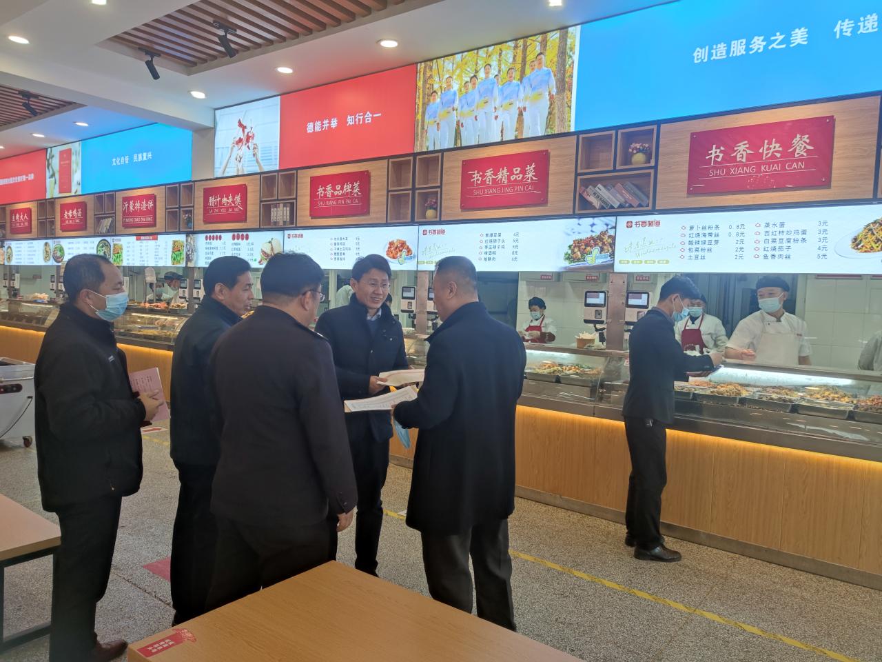 省商务厅驻青业务联络办公室主任姜宝臣,省商务厅办公室副主任、二级调研员赵松壁,省商务厅办公室四级调研员袁春,青岛市李沧区国保大队大队长王高鹏,青岛市李沧区市场监督管理局餐饮服务监管科科长高大勇,学院党委书记林凌家,纪委书记唐长臣,副院长程巍,办公室、组织人事处、宣传统战部、纪委、学生工作处(安保办)、后勤服务处等部门负责人,国际贸易系、财会金融系党总支书记参加了会议。