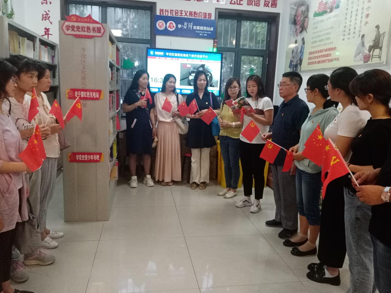 百通馨苑社区党支部钟书记热情接待了两个支部的老师们,并同大家一同观看了中国共产党党史发展视频《献礼建党100周年,这盛世如你所愿》。最后,党员们驻足在“学党史红色书屋”,通过诵读方式,重温了“党的发展史”的部分章节,加深对党的发展历史的认识和了解。