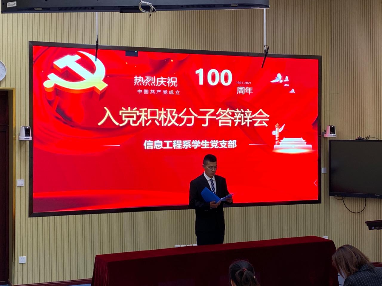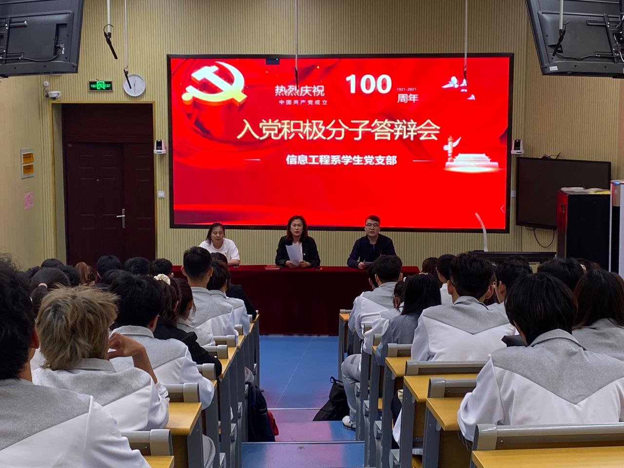 5月28日下午,信息工程系学生党支部2021年入党积极分子答辩会在1号教学楼第3阶梯教室举行,答辩会由学生党支部书记王奉清主持,系学生党支部在校党员参加,2020级部分班级学生参与旁听。