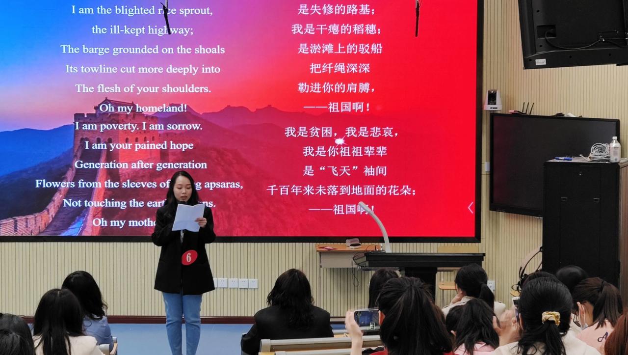 4月29日,第十二届“1+X证书 VETS”杯英语文化节“金口才”英文诗歌朗诵大赛决赛在1号楼第一阶梯教室举行。13组选手从初赛中脱颖而出晋级决赛。比赛吸引了各系学生前来观摩学习。公共英语部教师程诚、赵芳华、王凌、陈平、冷敏、张艳、万新霞担任评委。
