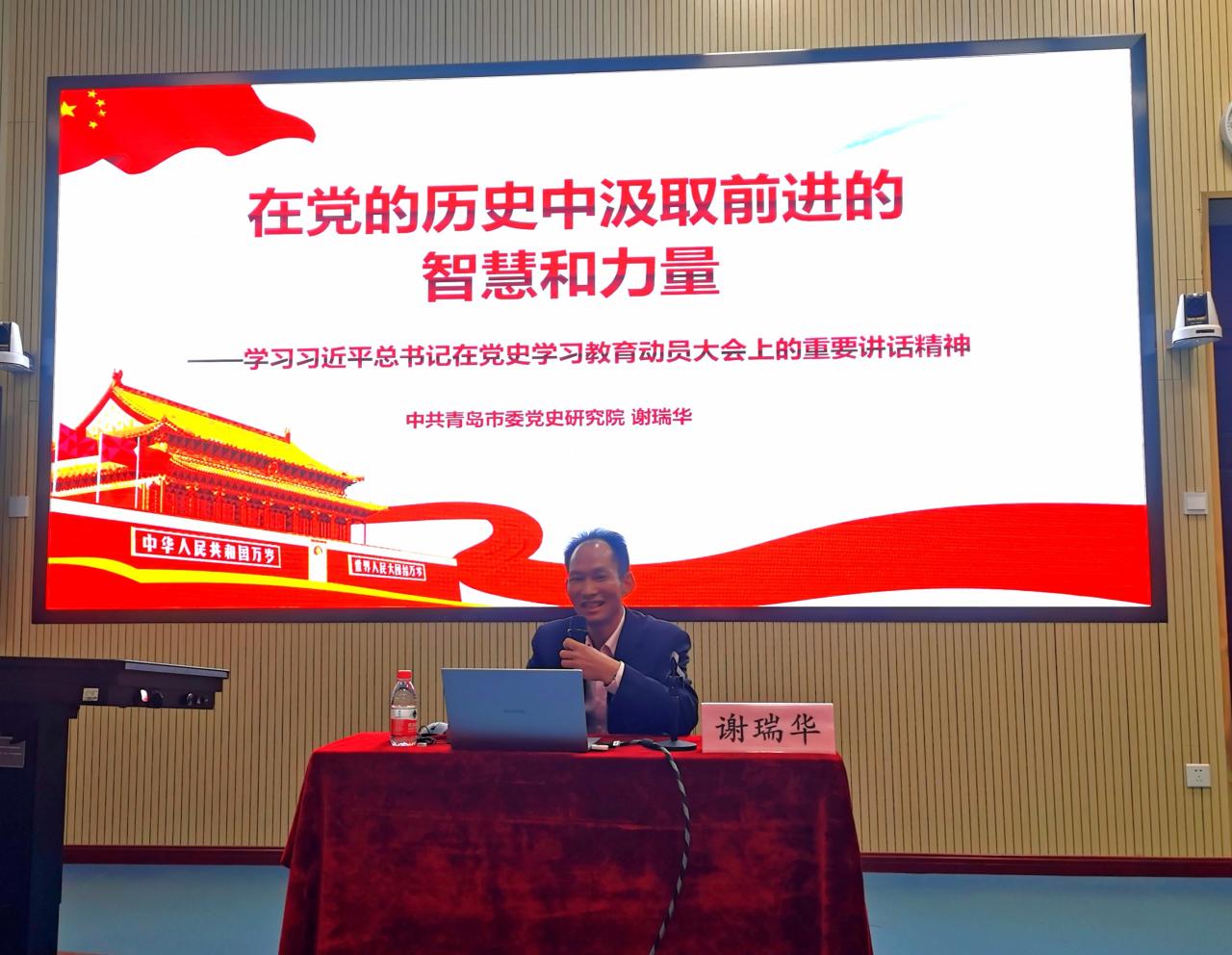 谢瑞华同志以《在党的历史中汲取前进的智慧和力量——学习习近平总书记在党史学习教育动员大会上的重要讲话精神》为题,从“树立大历史观,从历史长河中探索历史规律”、“学习党的历史,总结经验教训,不断开创马克思主义新境界”、“以实际工作成果检验学习的成效”三个方面,深刻阐述了开展党史学习的重要性和必要性,并结合在校师生实际,指出了学习的重点和方向。
