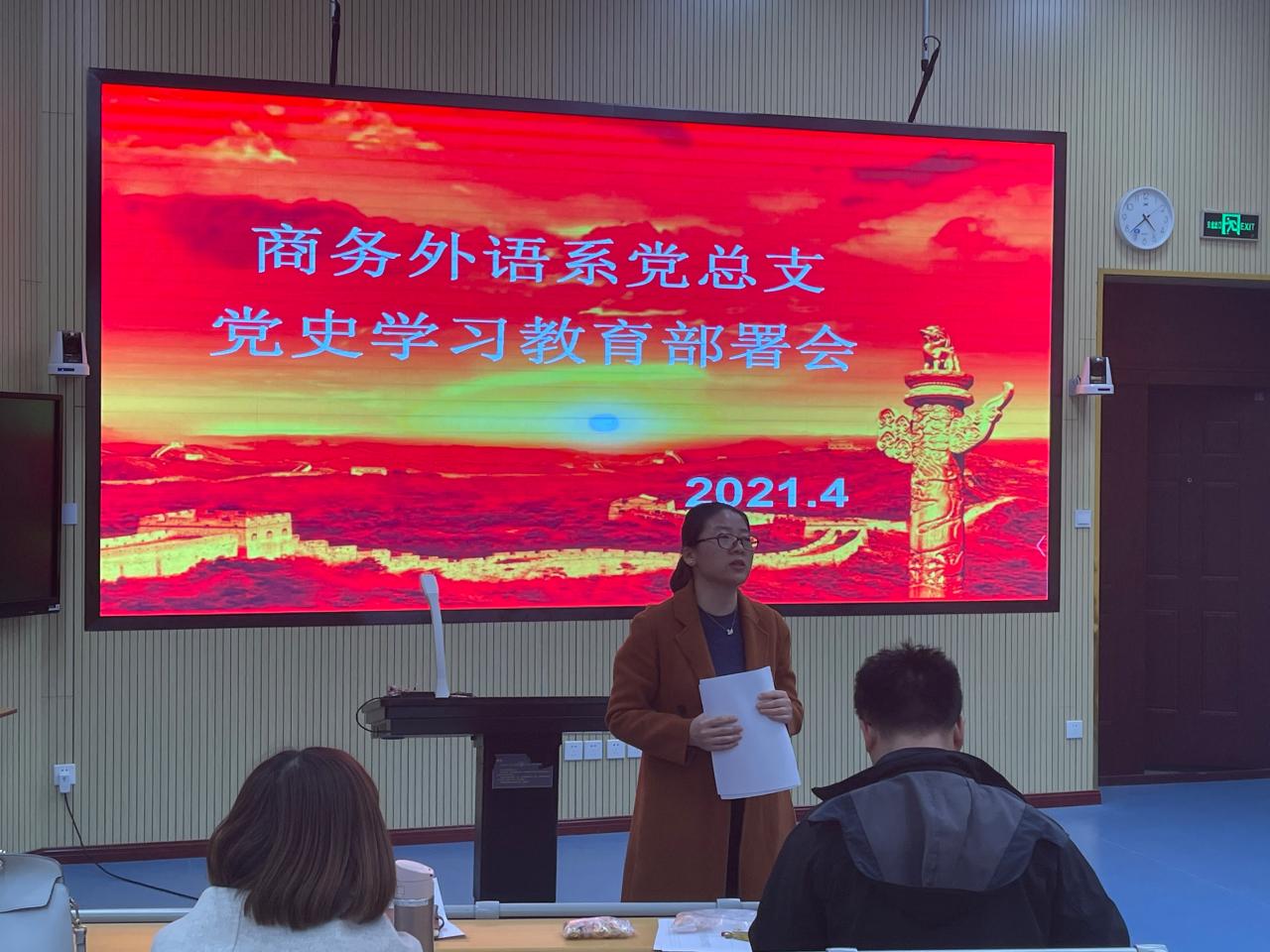 4月1日下午,商务外语系党总支在1号教学楼四阶召开党史学习部署会,商务外语系全体党员参加了部署会。