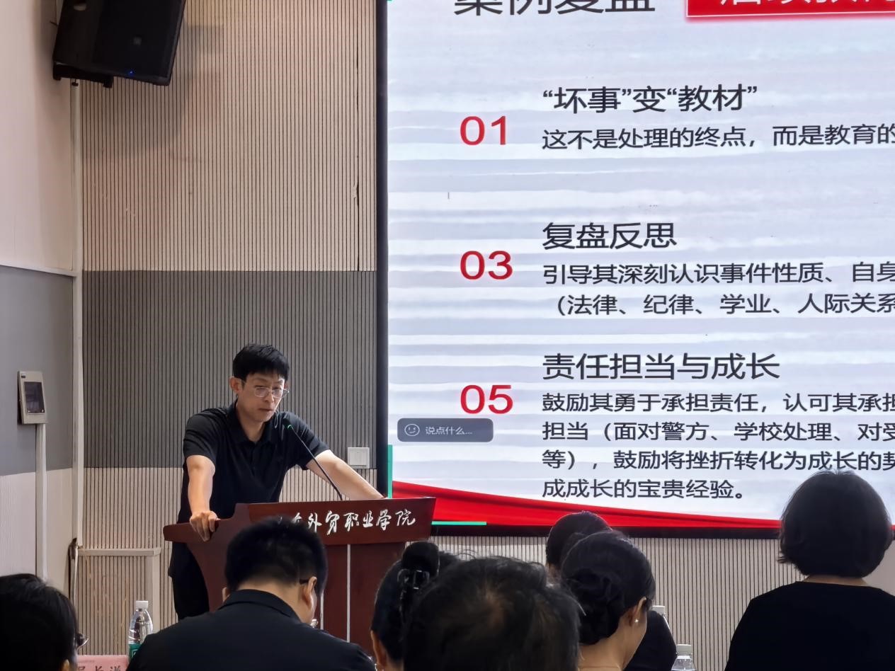 交流研讨阶段,各系及泰安教学部辅导员代表围绕新生入学、谈心谈话、危机干预、职业发展、就业工作等学生工作中的重难点问题,开展经验分享与交流。