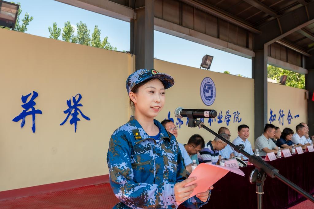 动员大会在庄严的国歌声中拉开帷幕。学院副院长张红智宣布军训团组织建制,党委副书记黄维向军训团团长授旗。2025级关务与外贸服务专业2班曲保蓉代表全体参训学生发言。