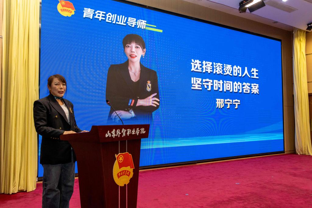 在创业事迹分享环节,全国资深教育媒体人、乐学网主编娄雷结合自身媒体创业与教育服务经历,剖析行业趋势与职业规划关键;深圳市顺丰同城物流有限公司青岛分公司党支部书记曲振兴以即时物流领域实践为例,分享团队管理与市场拓展经验;瑞园西餐厅总经理、李沧青年夜校联合创始人邢宁宁讲述跨领域创业心路,强调“成就他人亦是圆满自己”的创业理念;跨境电商协会副会长邱守彬、得亿阳光国际贸易总经理段玉梅则从国际化视野出发,为学子解析外贸行业机遇与挑战。嘉宾们以真实案例激励青年勇于尝试、敢于突破,在实干中找准职业方向。圆桌座谈和互动交流中,台上嘉宾和台下观众围绕“职业选择与基层历练”“创业资源整合与风险应对”等热点话题展开讨论,现场掌声不断。
