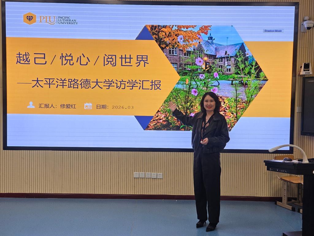 交流汇报分为四个部分,修爱红分别以“跨越山海,抵达塔科马”“博采众长,多元课堂的洗礼”“烟火日常,生活中的文化碰撞”“研学致远,不忘初心、砥砺前行”为主题,依次介绍了校园环境、初抵异国时的所见所感、学术收获、文化体验及访学感悟。在谈及学术收获的时候,她表示不仅通过深入课堂学习,观摩了不同学科的授课方式,还积极参与互动,亲身体验了美国高等教育中以学生为中心、鼓励批判性思维的教学模式,同时她从教学方法、课程设计、师生互动到学术资源等方面进行了细致入微的观察与思考。此次分享开阔了教师们的国际视野,也引导大家进行教学反思。此外,修爱红还以轻松幽默的方式讲述了在美期间充满“烟火气”的生活故事,生动展现了中美文化差异。最后,她表示访学经历不仅拓宽了学术视野,提升了教学能力,更是一次心灵的洗礼和对初心的回望。未来,她将以更开阔的胸怀、更坚定的步伐,践行教育者的使命,为学校发展贡献自己的力量。