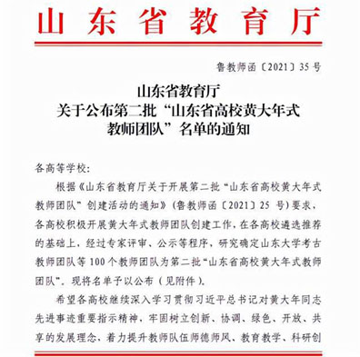 8月15日,山东省教育厅公布了第二批“山东省高校黄大年式教师团队”名单(鲁教师函[2021]35号),我院推荐申报的国际商务教师团队被确定为“山东省高校黄大年式教师团队”。这也是本次确定的100个“山东省高校黄大年式教师团队”中唯一的国际商务教师团队,凸显了我院在国际商务职业教育教师团队建设方面的鲜明特色和重大成就。